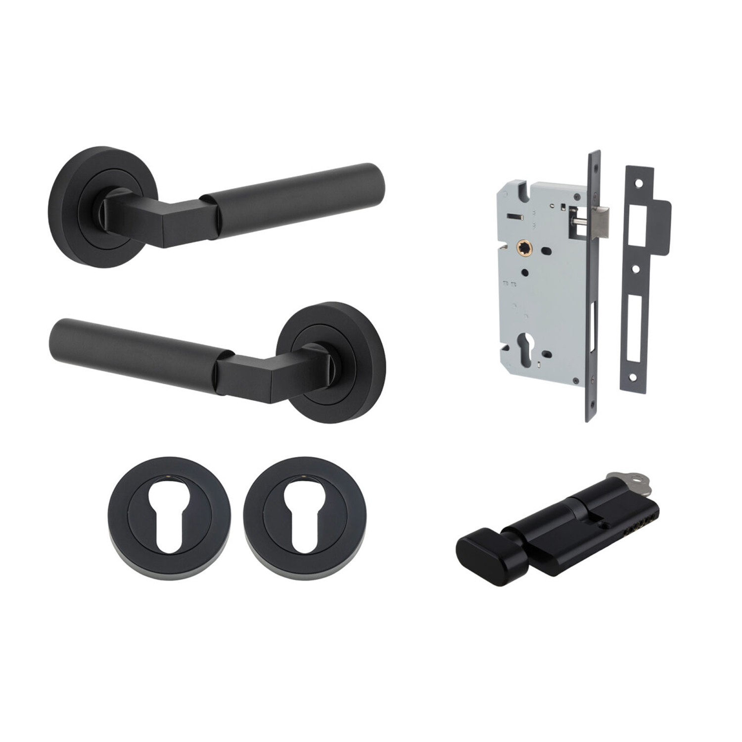 Iver Door Lever Berlin Rose Round Pair Matt Black L120xP60mm BPD52mm, Mortice Lock Euro Matt Black CTC85mm Backset 60mm, Euro Cylinder Key Thumb 5 Pin Matt Black 65mm KA4, Escutcheon Euro Round Pair Matt Black D52xP10mm